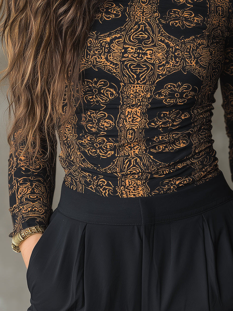 Retro Totem Print Stretch Knit Slim High Neck T-shirt