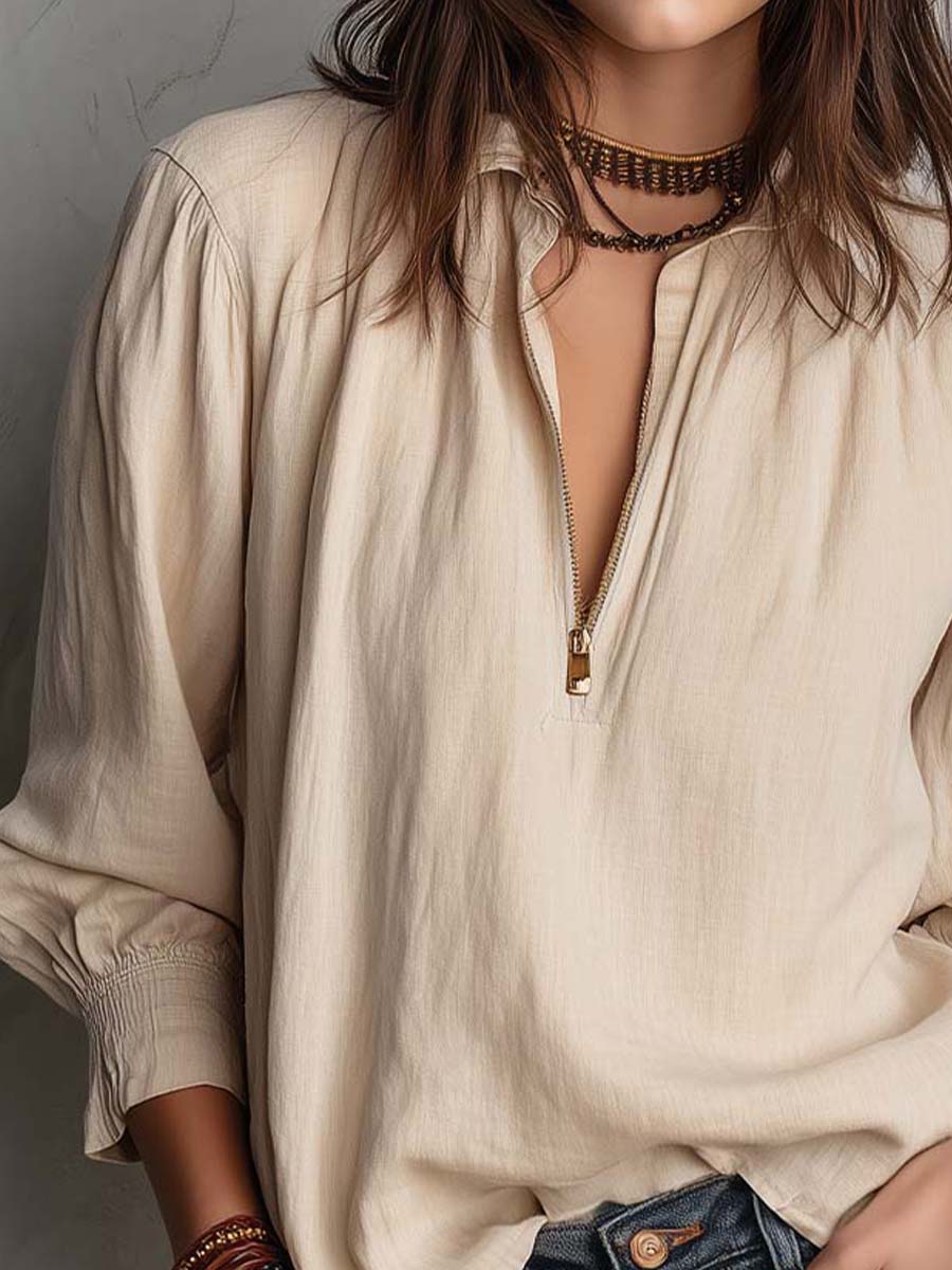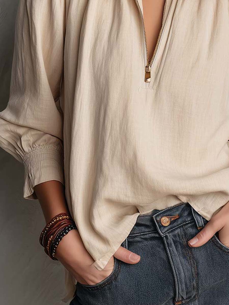 A soft, easygoing essential designed with understated bohemian charm. This relaxed half-zip shirt is crafted from a breathable woven fabric with a gently textured surface, offering a light and comfortable drape for everyday wear. The subtle gathers at the shoulders and the elastic cuffs create a feminine silhouette, while the antique-tone zipper adds a touch of effortless cool. Finished in a warm sandstone beige, it pairs seamlessly with denim for a natural, sun-washed look.