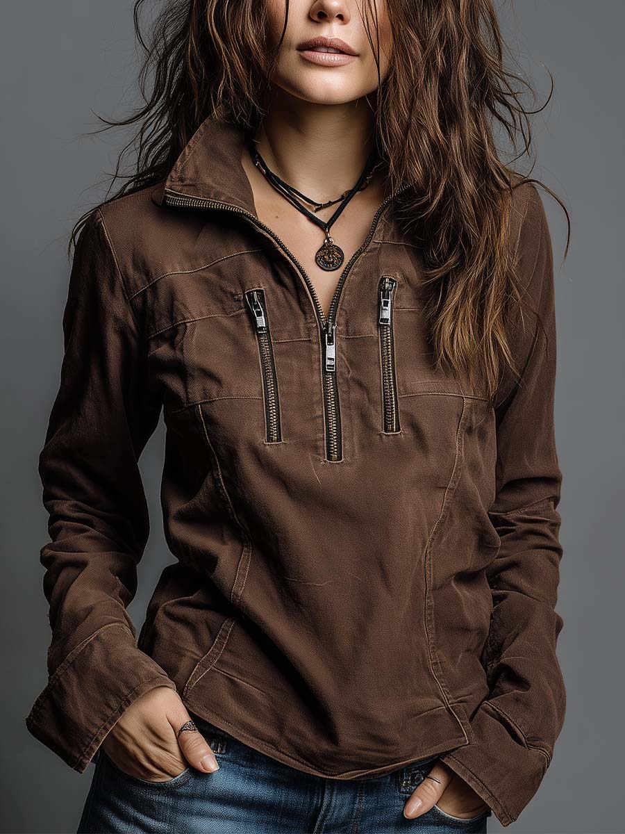 A rugged, vintage-inspired denim shirt crafted from pure cotton denim, designed with a naturally worn-in wash and soft handfeel. The rich brown tone brings a warm, earthy character, while the half-zip design and dual zip chest pockets add modern utility detailing. Light fading, subtle creases, and seam highlights give it an authentic, lived-in look. Ideal for women who love effortless boho-western style with practical features.