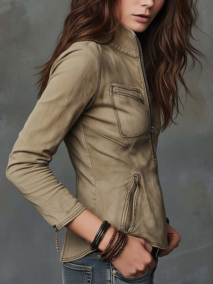 This washed khaki denim top blends utilitarian detailing with a sculpted, feminine fit. Made from 100% cotton denim, the piece features a soft, sun-faded wash that gives the khaki tone a naturally weathered and lived-in look. The deep front zipper allows adjustable styling, while the structured stand collar adds a clean, modern edge.