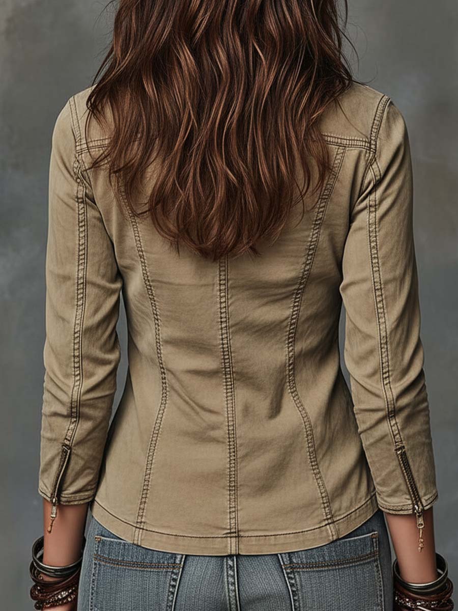 Washed Khaki Cotton Denim Utility Zip Top With Contoured Seams