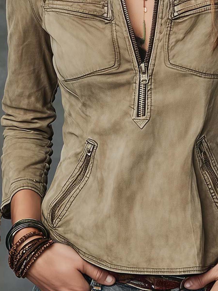 Four zippered pockets—two at the chest and two along the waist—enhance the utility aesthetic and create strong vertical lines. Contoured panel seams shape the midsection and visually define the waist, resulting in a flattering, fitted silhouette. The sleeves are slim and lightly wrinkled for a relaxed, broken-in effect.