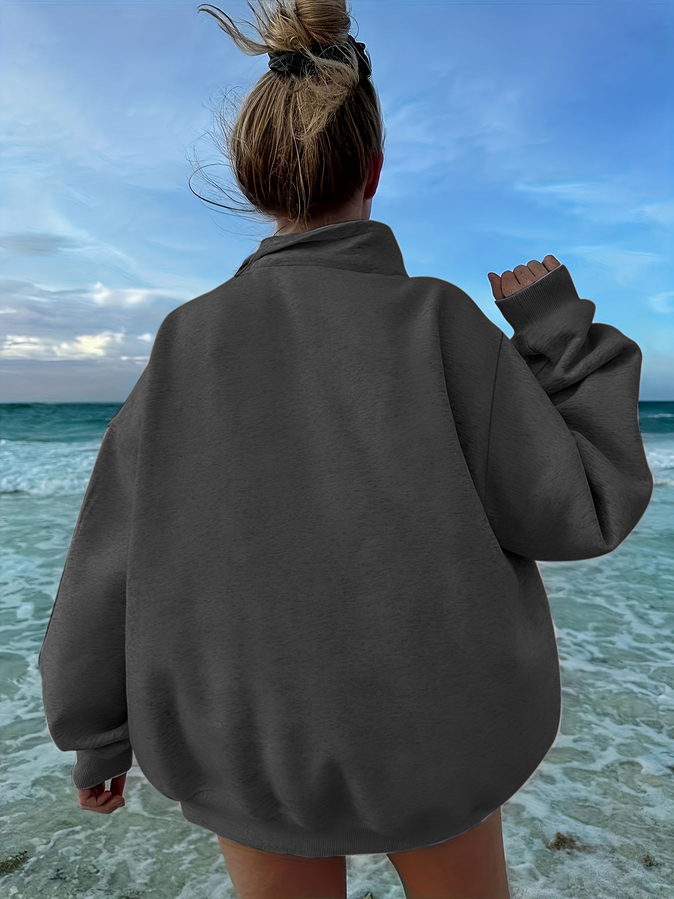 While many sweatshirts feel bulky or plain, Noelle brings a modern twist to everyday comfort. Made from soft fleece with a gentle stretch, it features a sleek half-zip, subtle chain detail, and a stand collar that adds structure and style. It’s your new go-to for cooler days when you want to stay warm without sacrificing style.